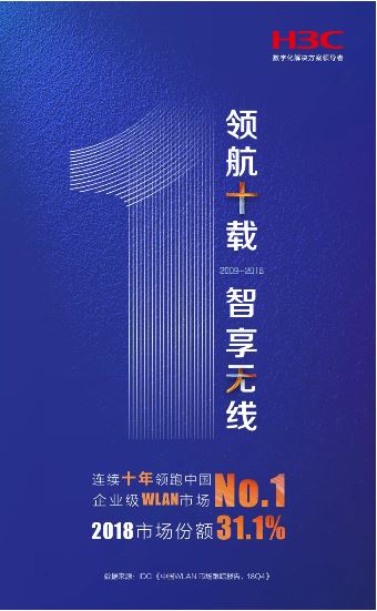 近日, 全球權(quán)威ICT市場(chǎng)研究機(jī)構(gòu)IDC發(fā)布的《中國(guó)WLAN市場(chǎng)跟蹤報(bào)告,18Q4》顯示,紫光旗下新華三集團(tuán)以31.1%的市場(chǎng)份額位居2018年中國(guó)企業(yè)級(jí)WLAN市場(chǎng)第一。從2009年到2018年,新華三已連續(xù)十年蟬聯(lián)中國(guó)企業(yè)級(jí)WLAN市場(chǎng)占有率第一,成為當(dāng)之無(wú)愧的行業(yè)領(lǐng)袖,彰顯了新華三在WLAN領(lǐng)域領(lǐng)先的技術(shù)實(shí)力與始終如一的可靠品質(zhì)。
